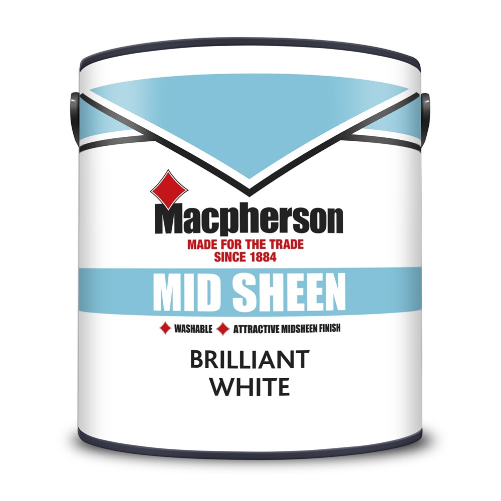 Macpherson Mid Sheen Emulsion Brilliant White 2.5L is an attractive interior wall and ceiling paint that delivers a washable finish with a gentle level of sheen. Sitting between matt and silk in appearance, it offers a practical decorative option for rooms where a little more light reflection is preferred without creating a full gloss effect.