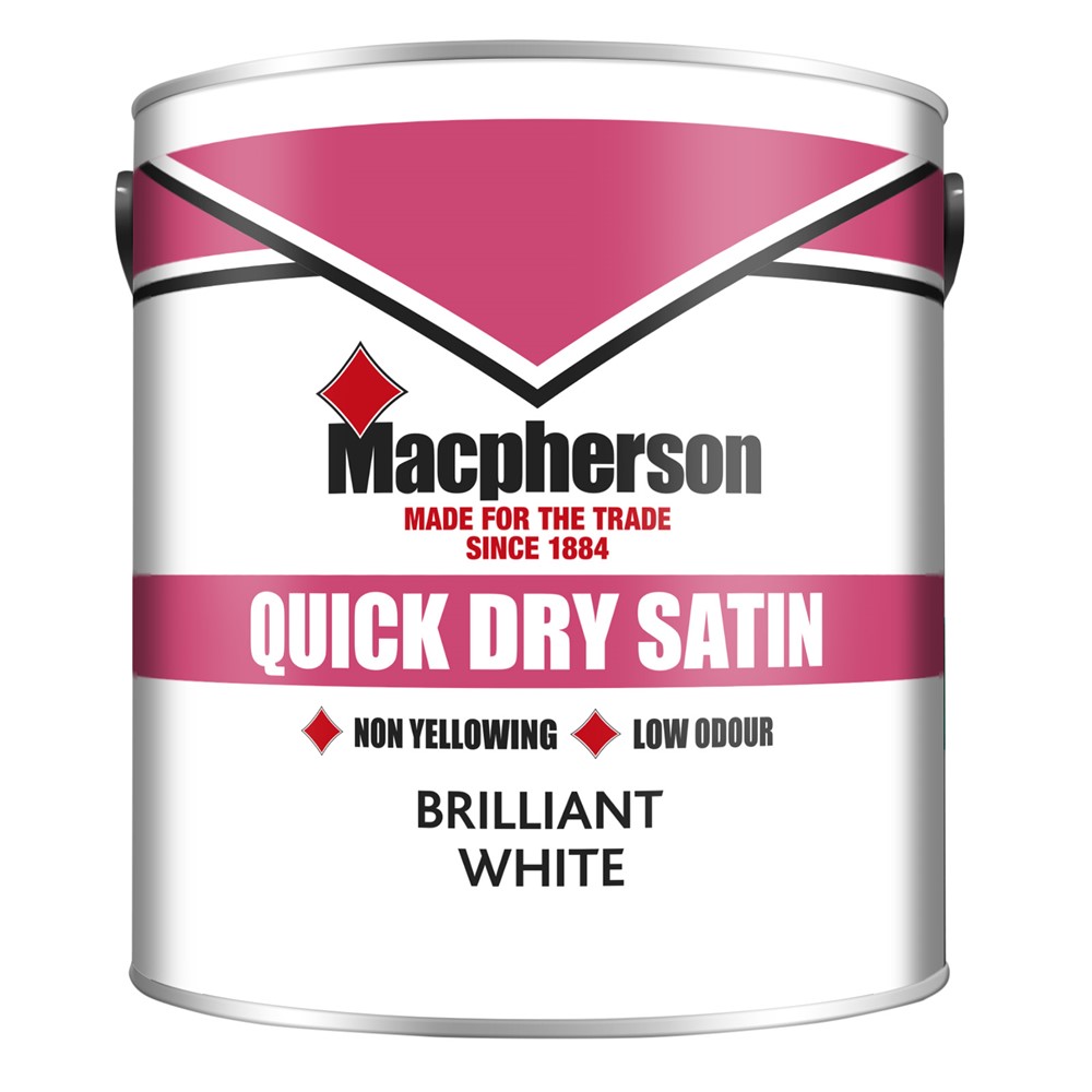 Macpherson Quick Dry Satin Brilliant White 2.5L is a practical trim paint formulated to provide a smooth satin finish on interior wood and suitably primed metal. Its fast-drying formulation, together with strong flow and levelling properties, helps achieve a smart and even decorative result with less waiting time between stages.