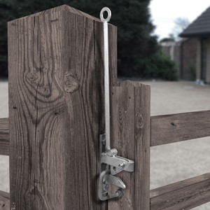 Galvanised hunting gate latch with straight handle, providing a traditional closing method for field and garden gates.