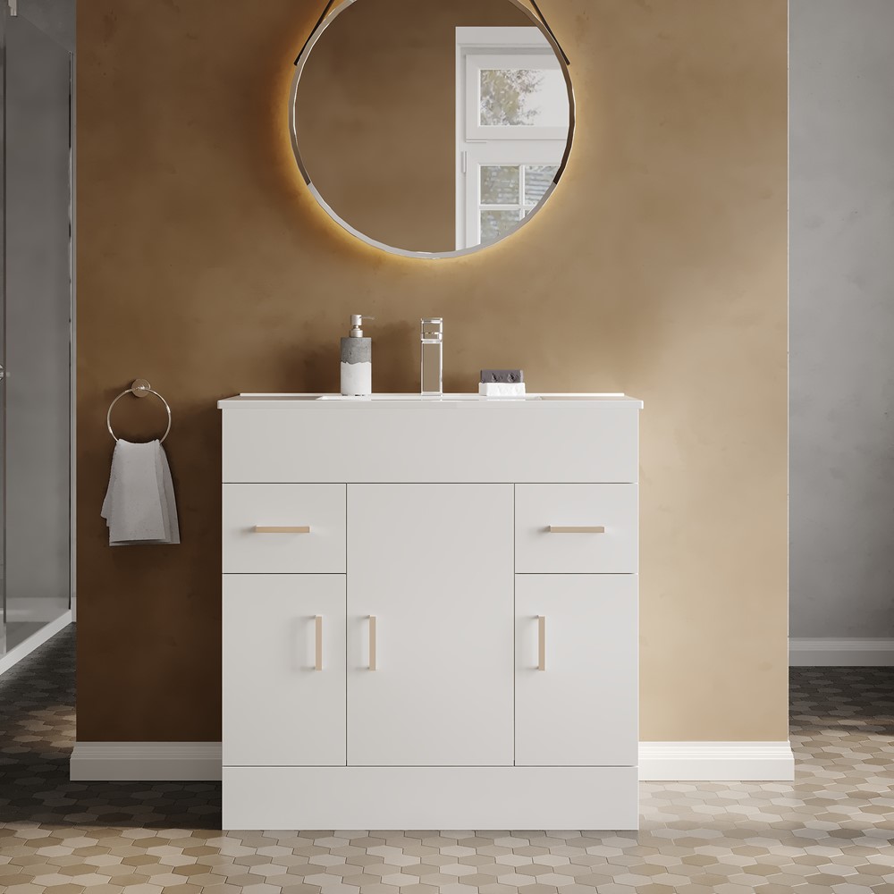 The Turin floor standing 3 door 2 drawer vanity unit with minimalist basin is an 800mm wide furniture and basin combination designed for modern bathrooms. Finished in gloss white for easy coordination with contemporary sanitaryware, the unit features a streamlined minimalist basin that sits neatly above the cabinet for a clean, integrated look.