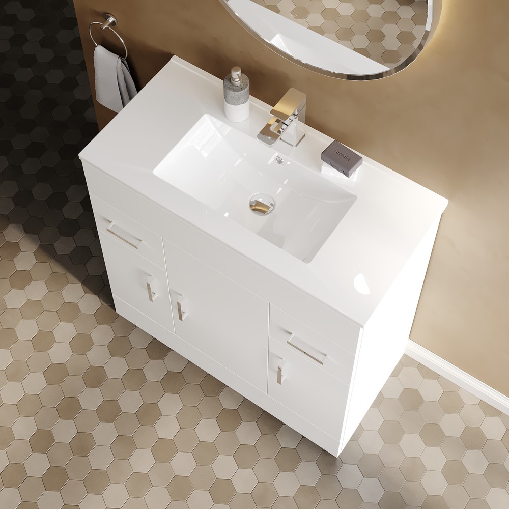 This layout provides practical storage through three soft-close cupboard doors and two drawers, offering organised space for toiletries, towels and everyday essentials. Constructed from MFC painted gloss board using a rigid cam and wood-dowel assembly, the unit is supplied fully assembled for straightforward installation. The minimalist basin offers a refined profile while still delivering comfortable bowl depth for routine use.